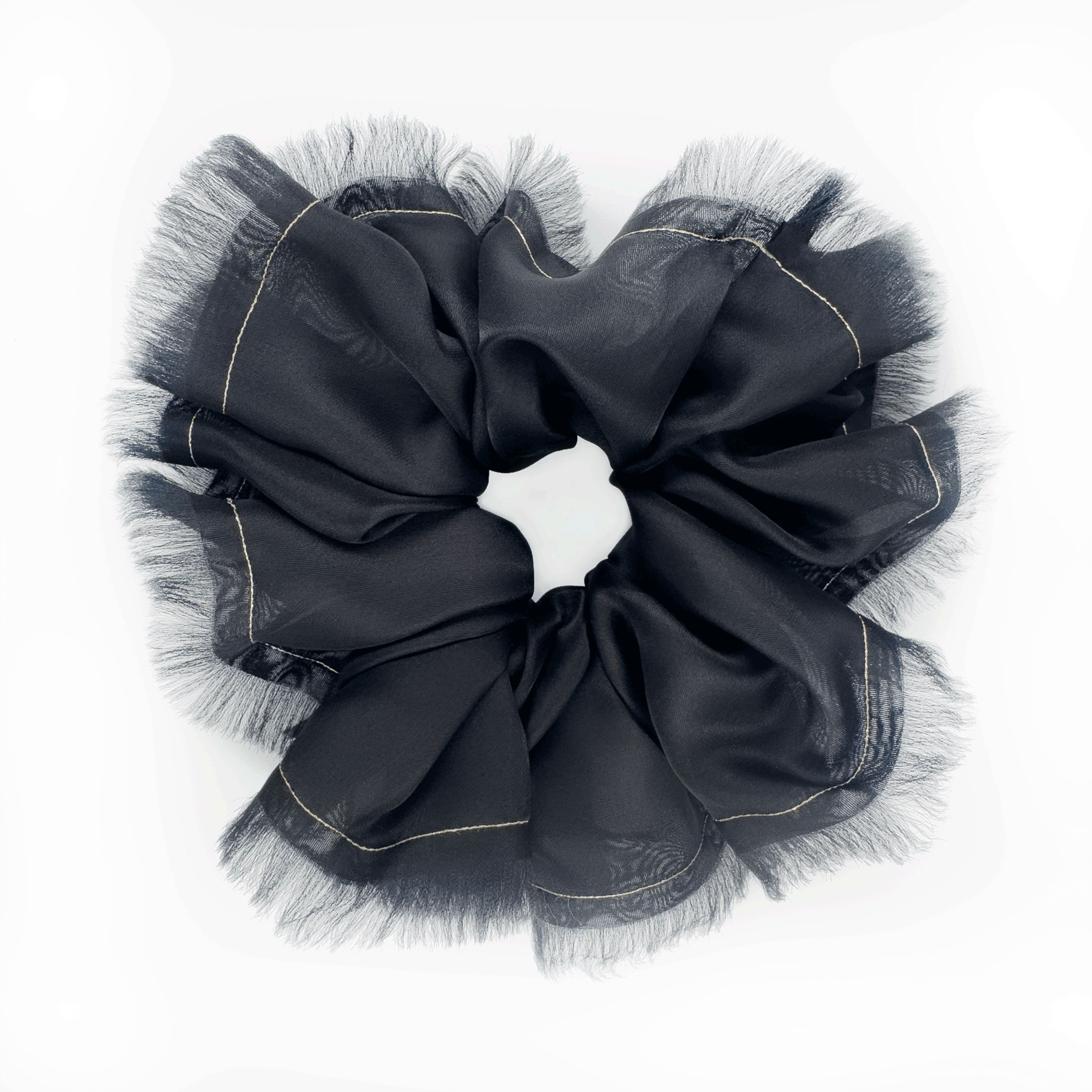 Delicate yet bold, this oversized scrunchie is handcrafted from luxurious 100% silk organza and adorned with shimmering gold metallic thread for an understated touch of glamour. Its soft, airy structure and frayed edges create a voluminous silhouette that effortlessly dresses up ponytails, buns, or even your wrist.