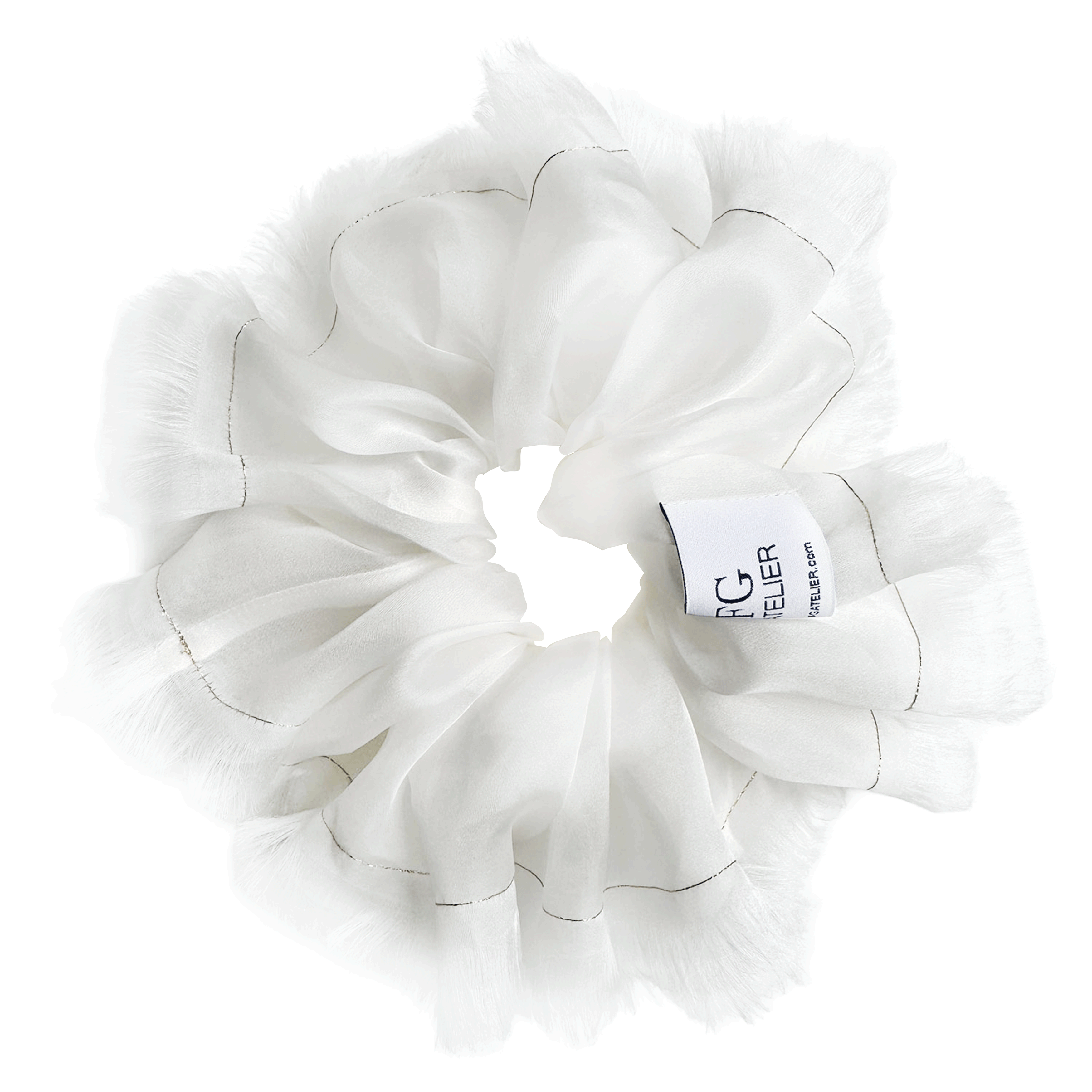 Delicate yet bold, this oversized scrunchie is handcrafted from luxurious 100% silk organza and adorned with shimmering gold metallic thread for an understated touch of glamour. Its soft, airy structure and frayed edges create a voluminous silhouette that effortlessly dresses up ponytails, buns, or even your wrist.
