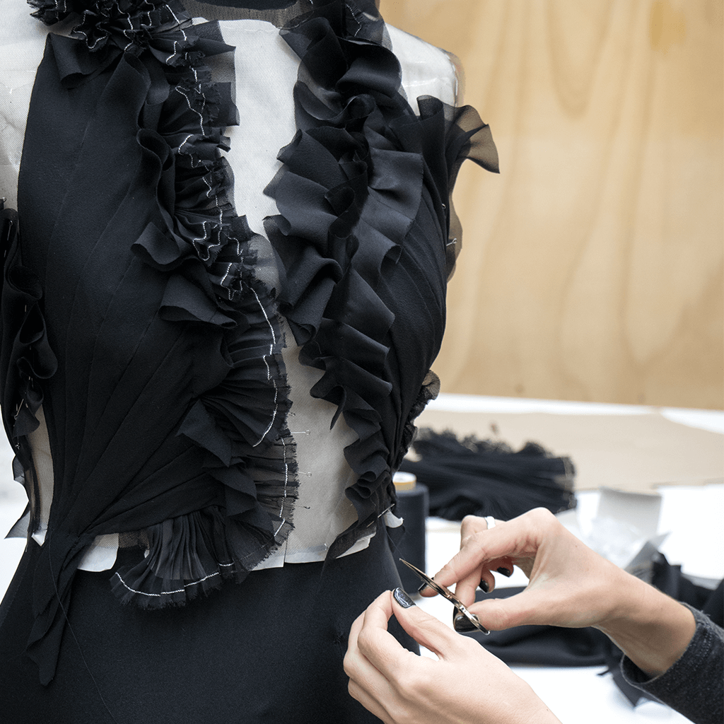 At our atelier, the creation of each piece is a testament to the art of fashion, meticulously crafted in small batches and predominantly made-to-order, offering an unparalleled level of exclusivity and a personal touch.